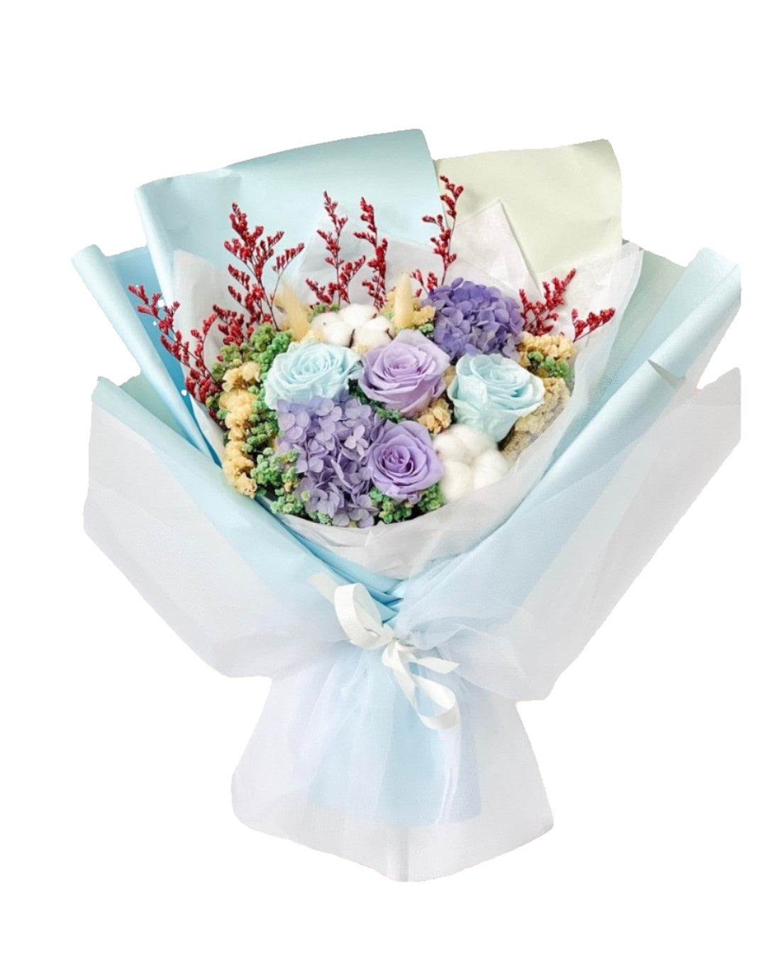 Tilly Tutu is a preserved flower bouquet of mainly roses and single/double premium dose of cotton flower. Tastefully wrapped with a layer of organza for that little Tilly Tutu touch.